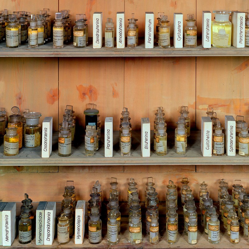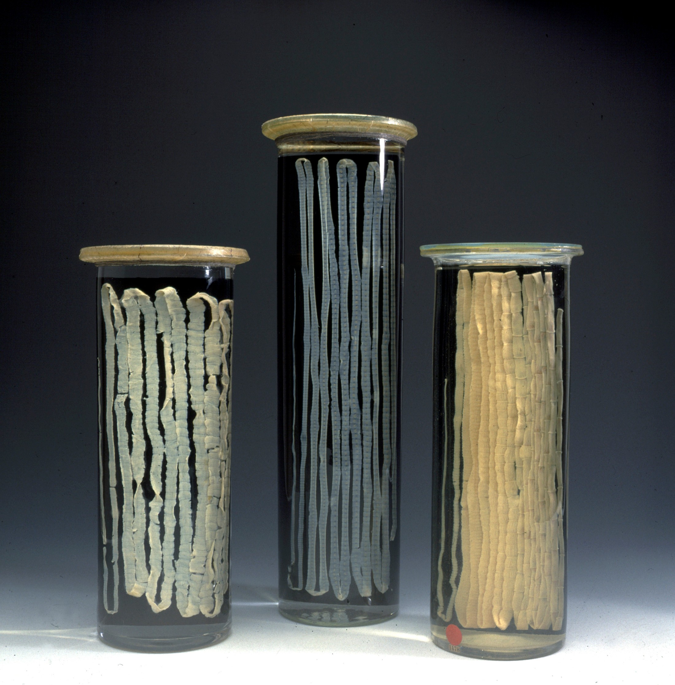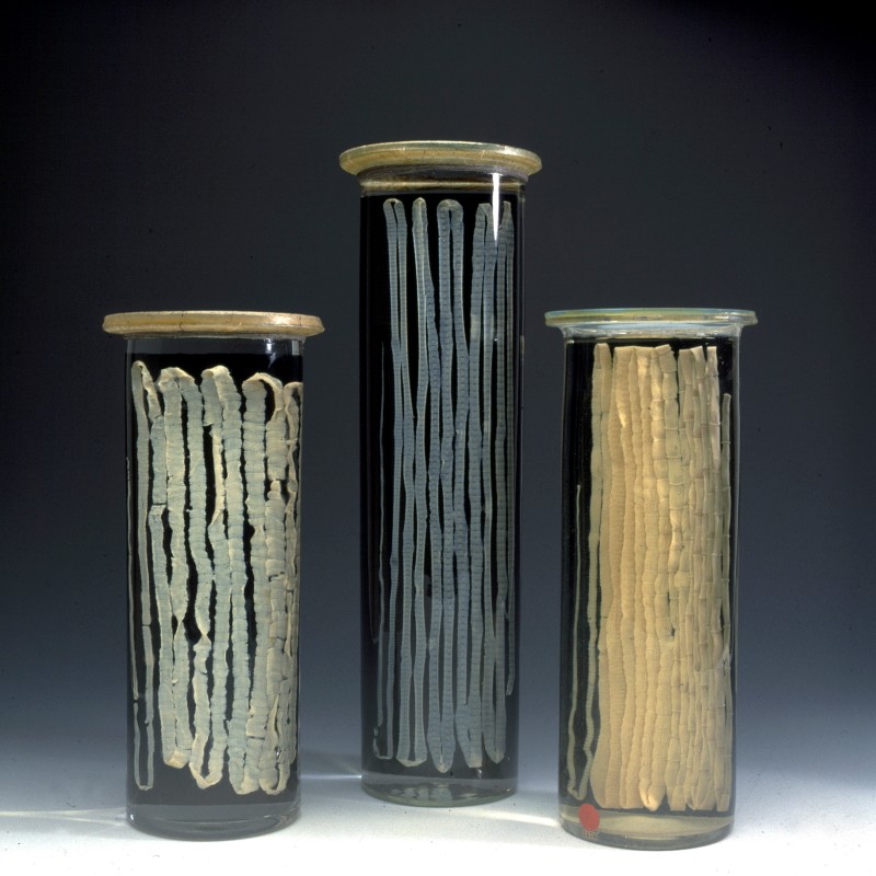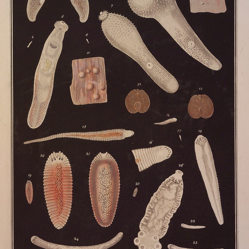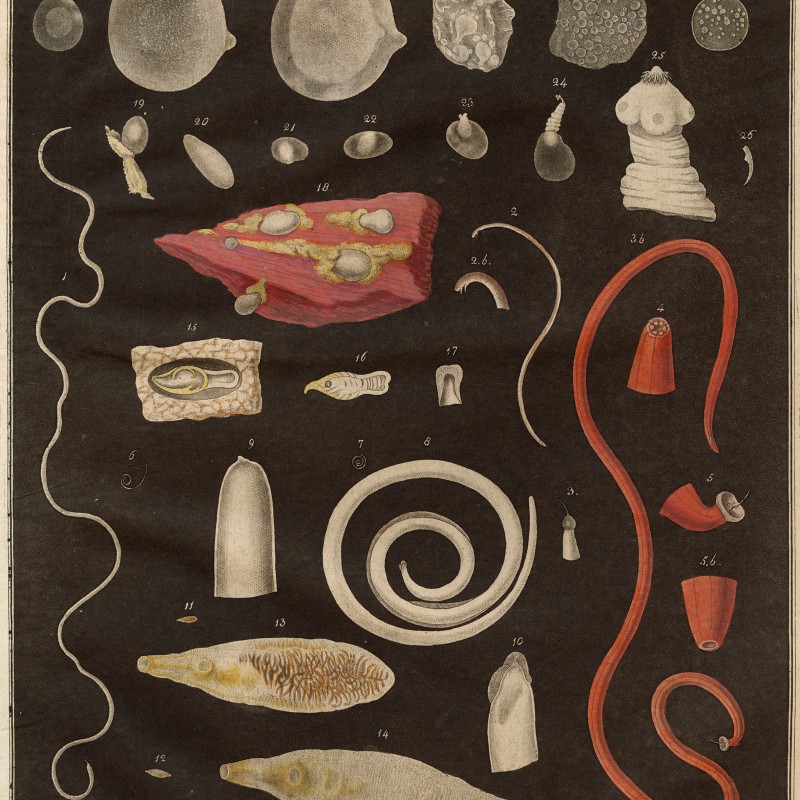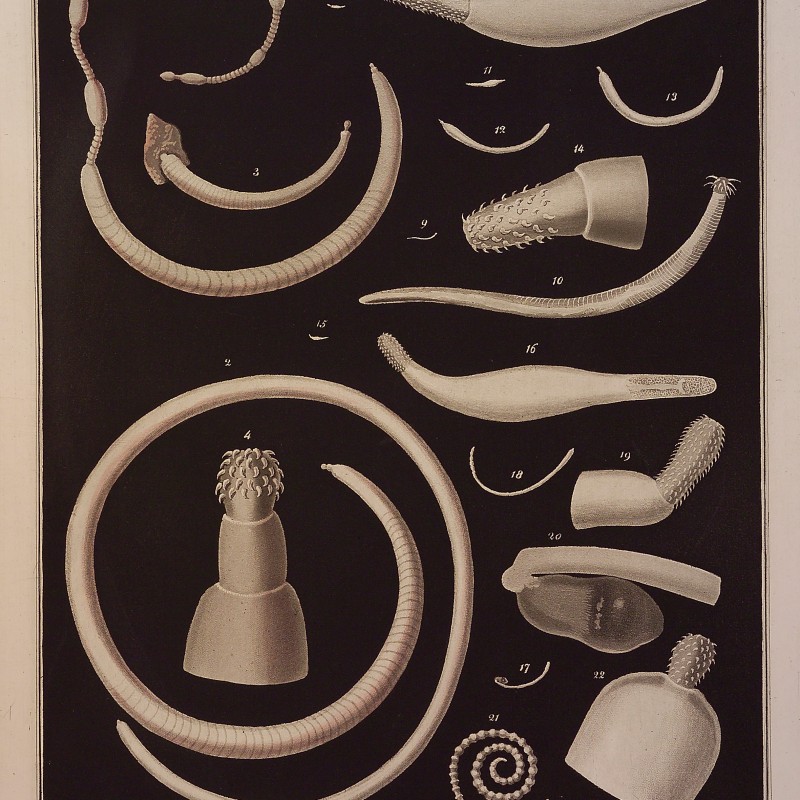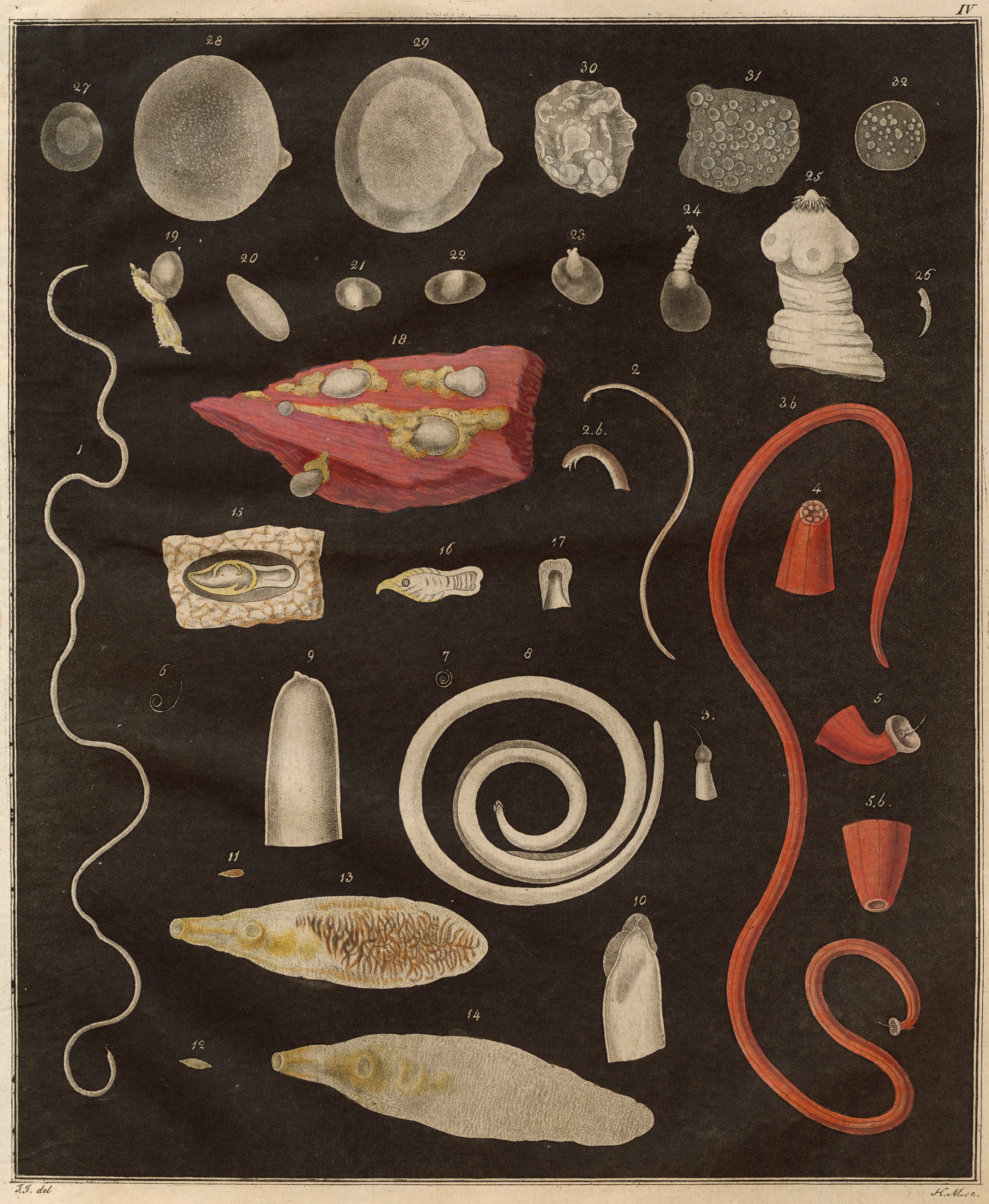 Tafel IV aus: Bremser J.G. 1819: "Lebende Würmer im lebenden Menschen.", verschiedene Eingeweidewürmer.