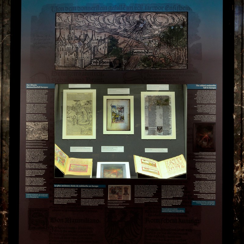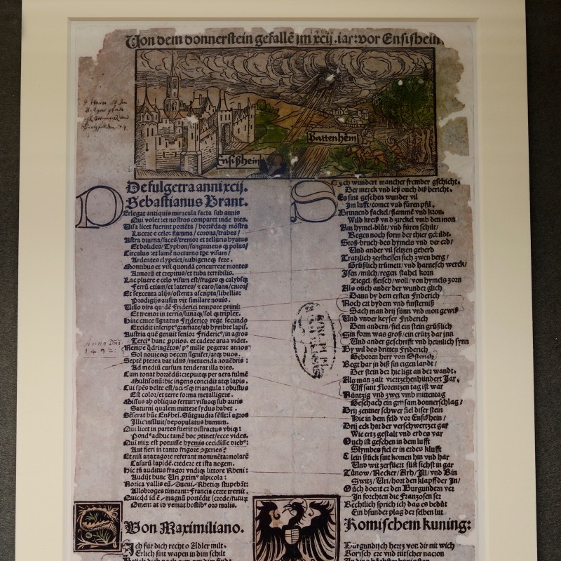 Flugblatt von Sebastian Brant mit einer Darstellung des „Donnersteins“ bei „Ensisshein“ und einer Beschreibung des Fallereignisses in Latein und Deutsch sowie an Maximillian I. gerichtete Verse (1492).