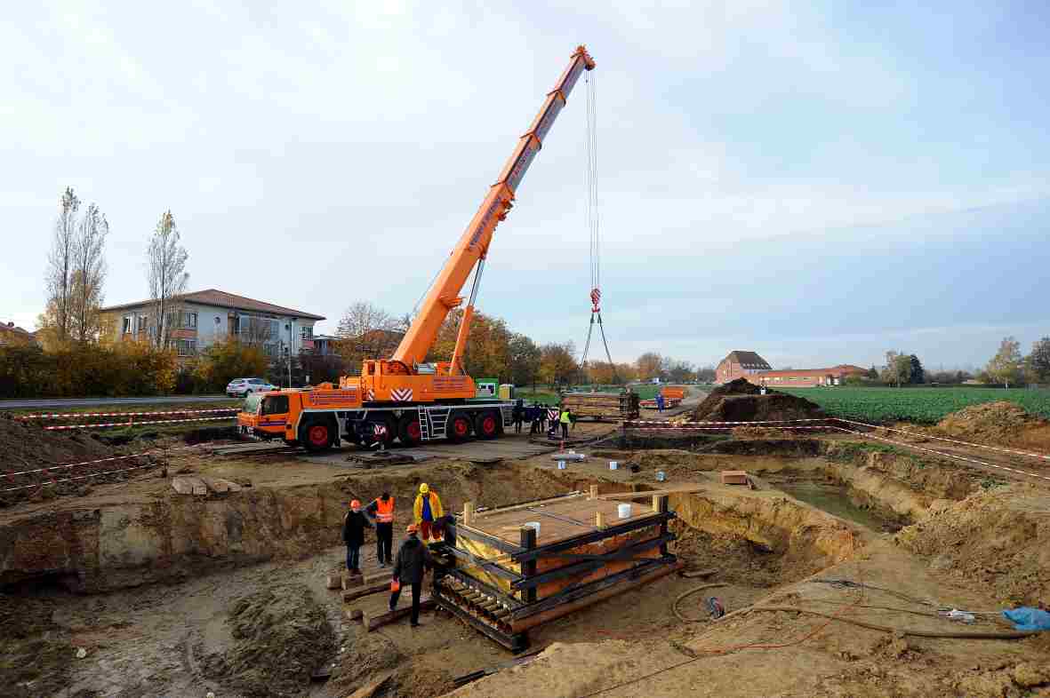 aufwendig gehoben. Der insgesamt 55 Tonnen schwere Erdblock mit sechs mal sieben Meter Grundfläche ist nun zweigeteilt im