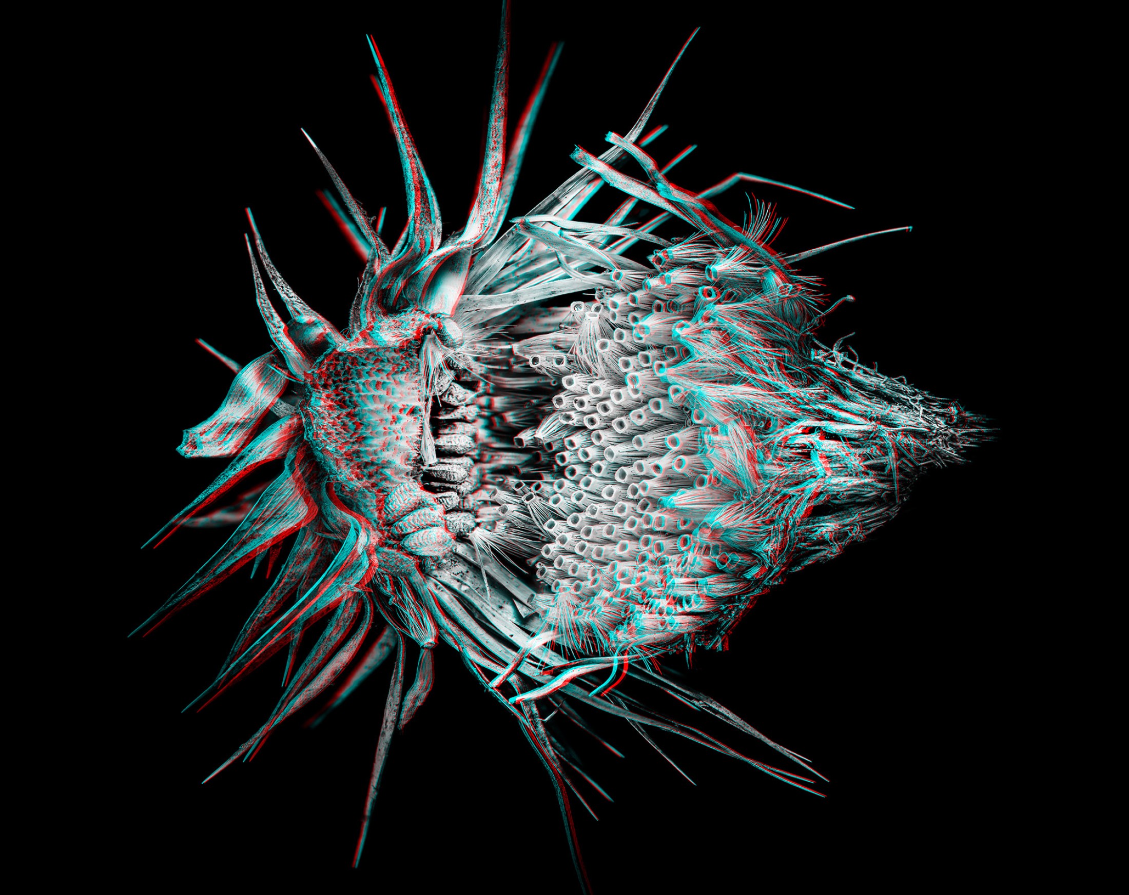 Mit einer Anaglyphenbrille lassen sich die Motive als dreidimensionale Skulpturen erfahren und es entsteht ein paradoxes Raumgefühl: Der Bildraum wirkt zugleich echt und unwirklich, körperlich und ornamental.