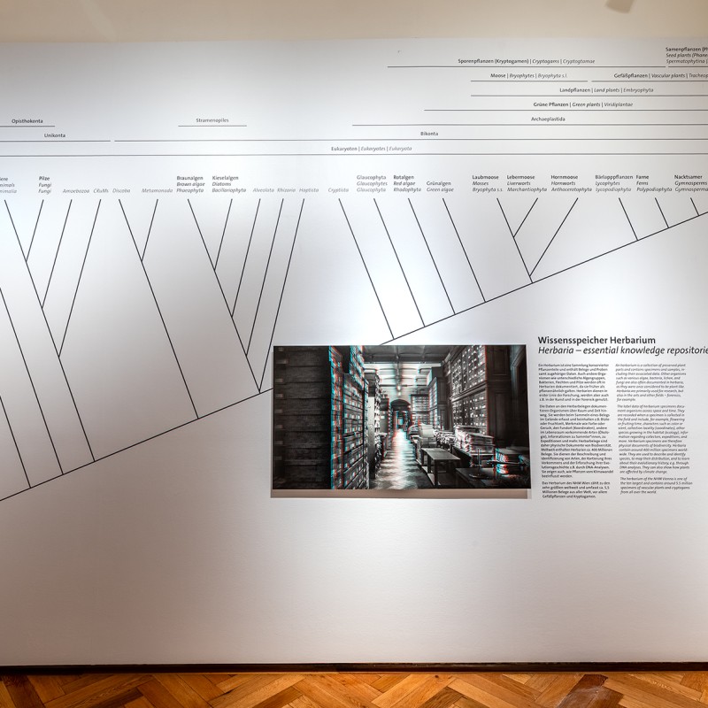 Z.B. sind Herbarbelege mittlerweile oft eine Quelle für Material für DNA-Analysen. Hier wird ein kleiner Teil eines Blattes entfernt und die DNA im Labor isoliert und sequenziert. Phylogenetische Analysen der DNA-Sequenzen ergeben eine Phylogenie, einen Stammbaum, der die evolutionären Verwandtschaftsverhältnisse in Bezug auf gemeinsame Vorfahren der analysierten Gruppen grafisch veranschaulicht. Es geht darum zu verstehen welche Gruppen im Vergleich zu anderen näher miteinander verwandt sind, da diese Information z.B. hilfreich ist herauszufinden welche Gruppen ähnliche chemische Verbindungen, und in Folge, medizinische Wirkstoffe beinhalten (z.B. für Bioprospektion). Z. B. zeigen solche Analysen, dass Pilze näher zu Tieren verwandt sind als zu Pflanzen. In TWO VIEWS ON PLANTS zeigen wir den ersten phylogenetischen Stammbaum in einer Ausstellung des NMH Wien, wobei im Zuge der Neugestaltung der permanenten Schausäle weitere dieser Darstellungen zur Veranschaulichung der evolutionären Beziehungen von Organismen kommen sollen.