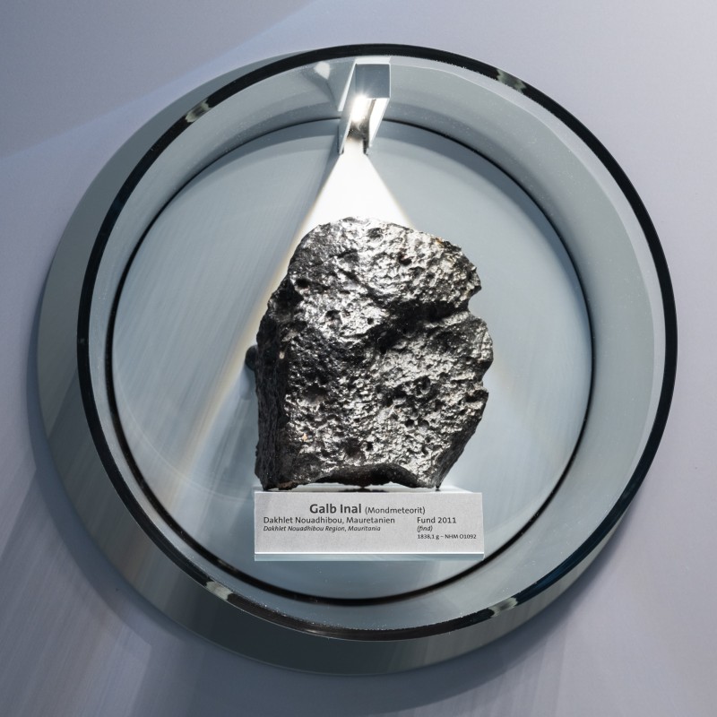 im Meteoritensaal des NHM Wien zu sehen. Mit einem Gewicht von fast 2 kg ist der Meteorit eines der größten Mondgesteine,