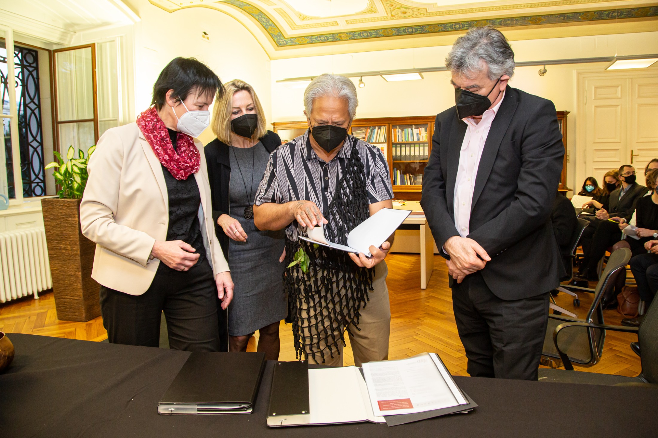 (Pule) und Ansprachen der Vertreter*innen wurde schließlich das offizielle Übergabeprotokoll in den Museumsräumlichkeiten