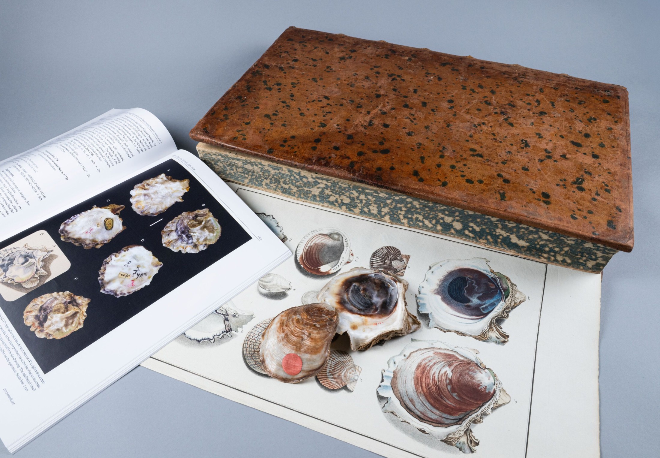 Prachtband von 1780 mit ausgeklappter Farbtafel, dem Originalexemplar einer von Born neu beschriebenen Austern-Art und der