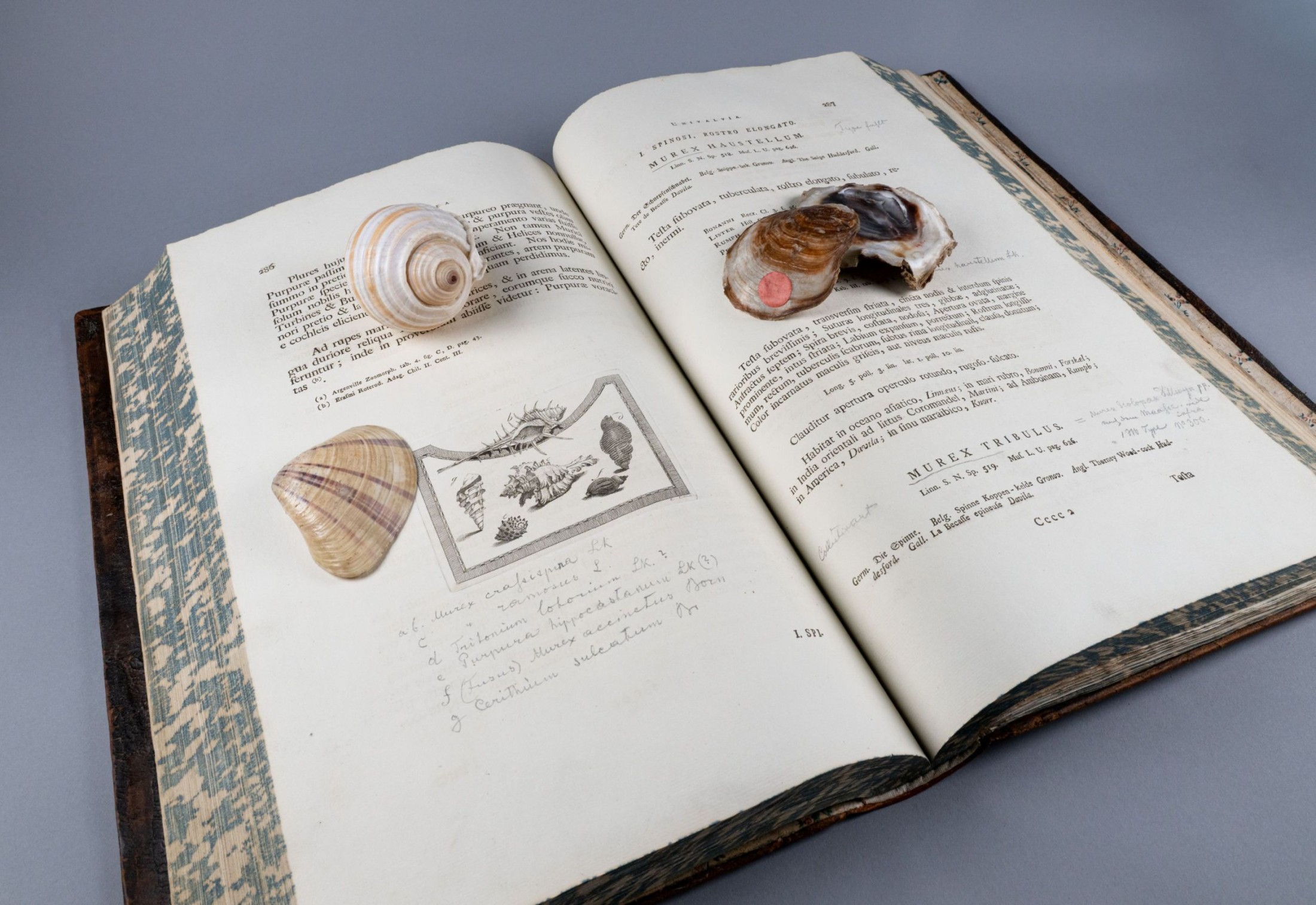 Prachtband von 1780 mit ausgeklappter Farbtafel, dem Originalexemplar einer von Born neu beschriebenen Koffermuschel-Art und