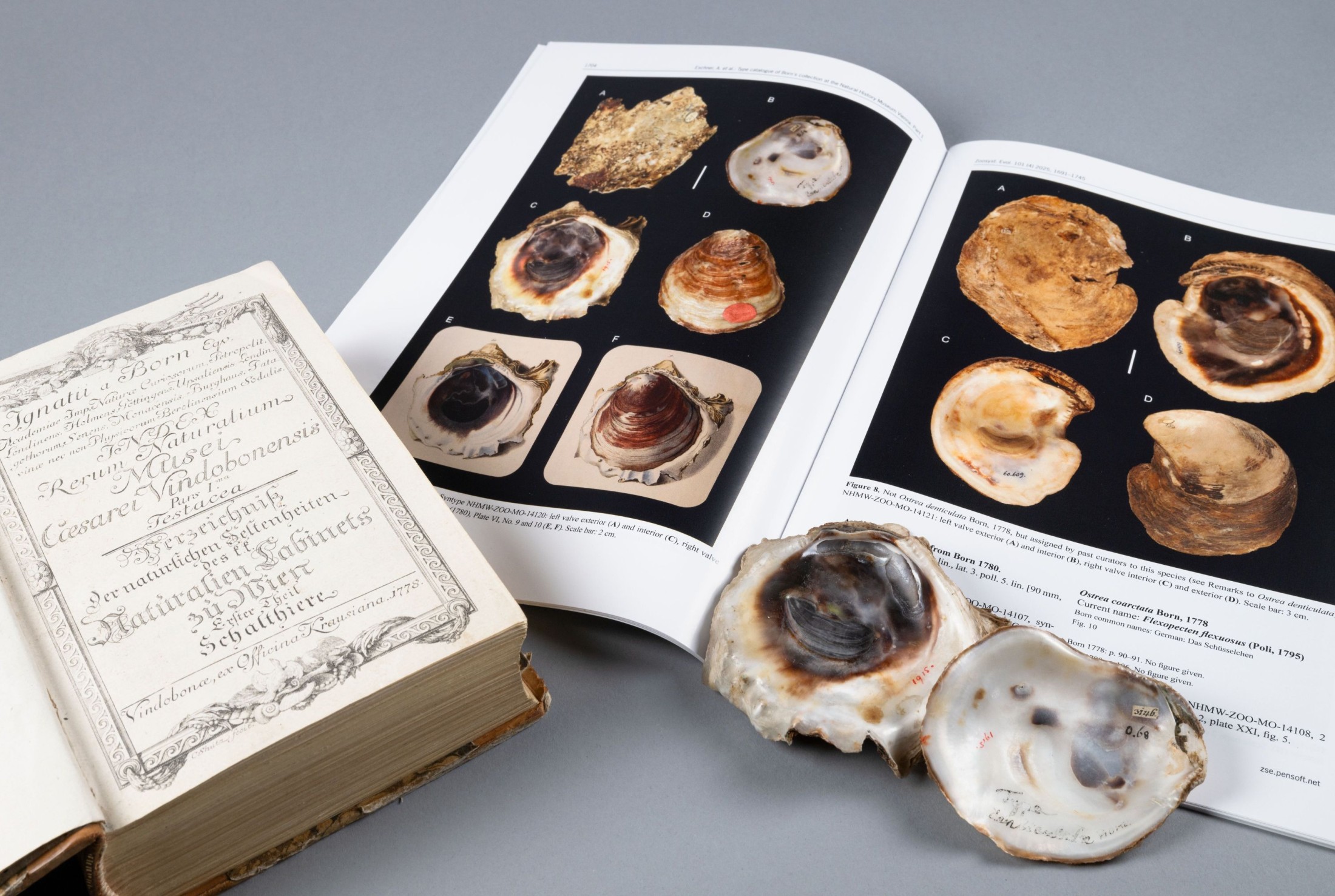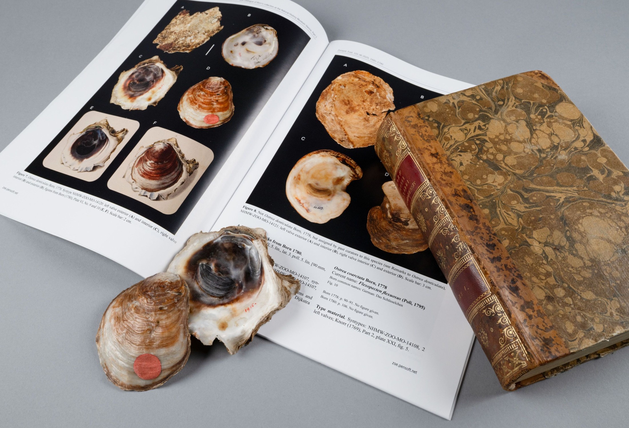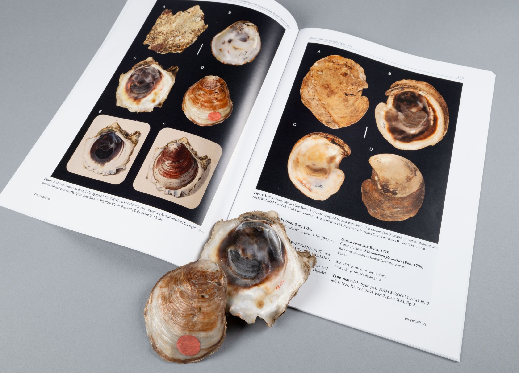 Druckversion des neuen Typenkataloges mit dem Originalexemplar einer von Born neu beschriebenen Austern-Art und der Taschenbuch-Ausgabe