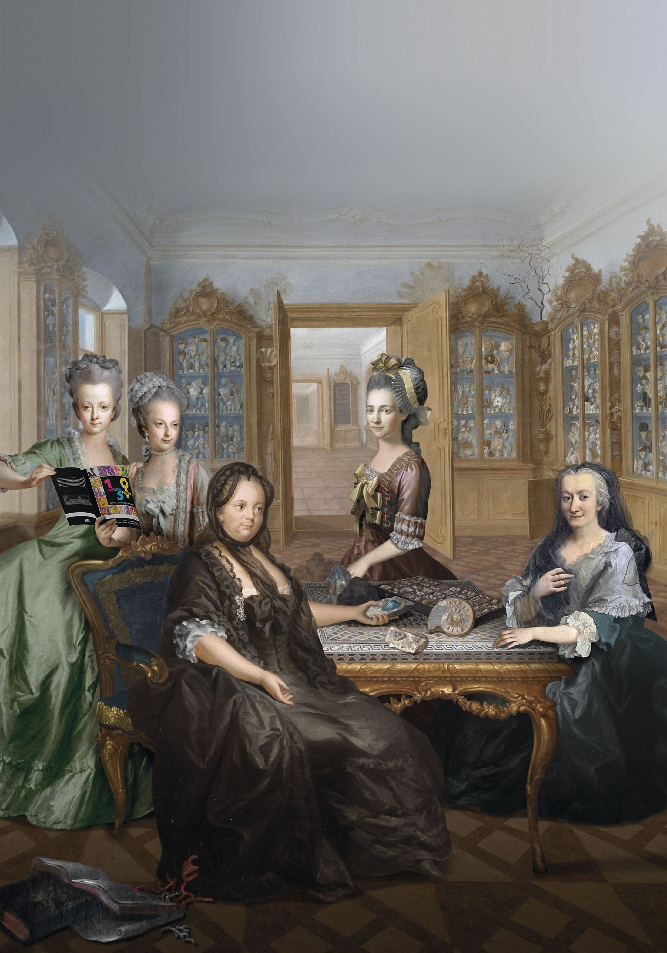 Von 3. bis 17. März 2026 verändert sich das Museum wieder an prominenter Stelle: Das männlich dominierte Kaiserbild auf der Feststiege, das den Kaiser im Kreise seiner Gelehrten zeigt, wird verhüllt und wir geben der "Gründermutter" des NHM Wien, Maria Theresia, die ihr gebührende Präsenz. Sie selbst beauftragte dieses Gemälde, um ihrem Mann ein Denkmal zu setzen. Ihr ist es zu verdanken, dass Franz Stephans Naturaliensammlung nach seinem Tod für die Öffentlichkeit zugänglich gemacht wurde. Die Aufstellung der Sammlung, wie sie am Bild zu sehen ist, geht ebenfalls auf die Monarchin zurück: Sie sorgte dafür, dass diese wissenschaftlich inventarisiert und geordnet wurde. Die adeligen Damen, die rund um Maria Theresia versammelt sind, stehen stellvertretend für die zahllosen Frauen, die die Geschichte der Sammlungen und des Museums im Laufe der Jahrhunderte prägten.