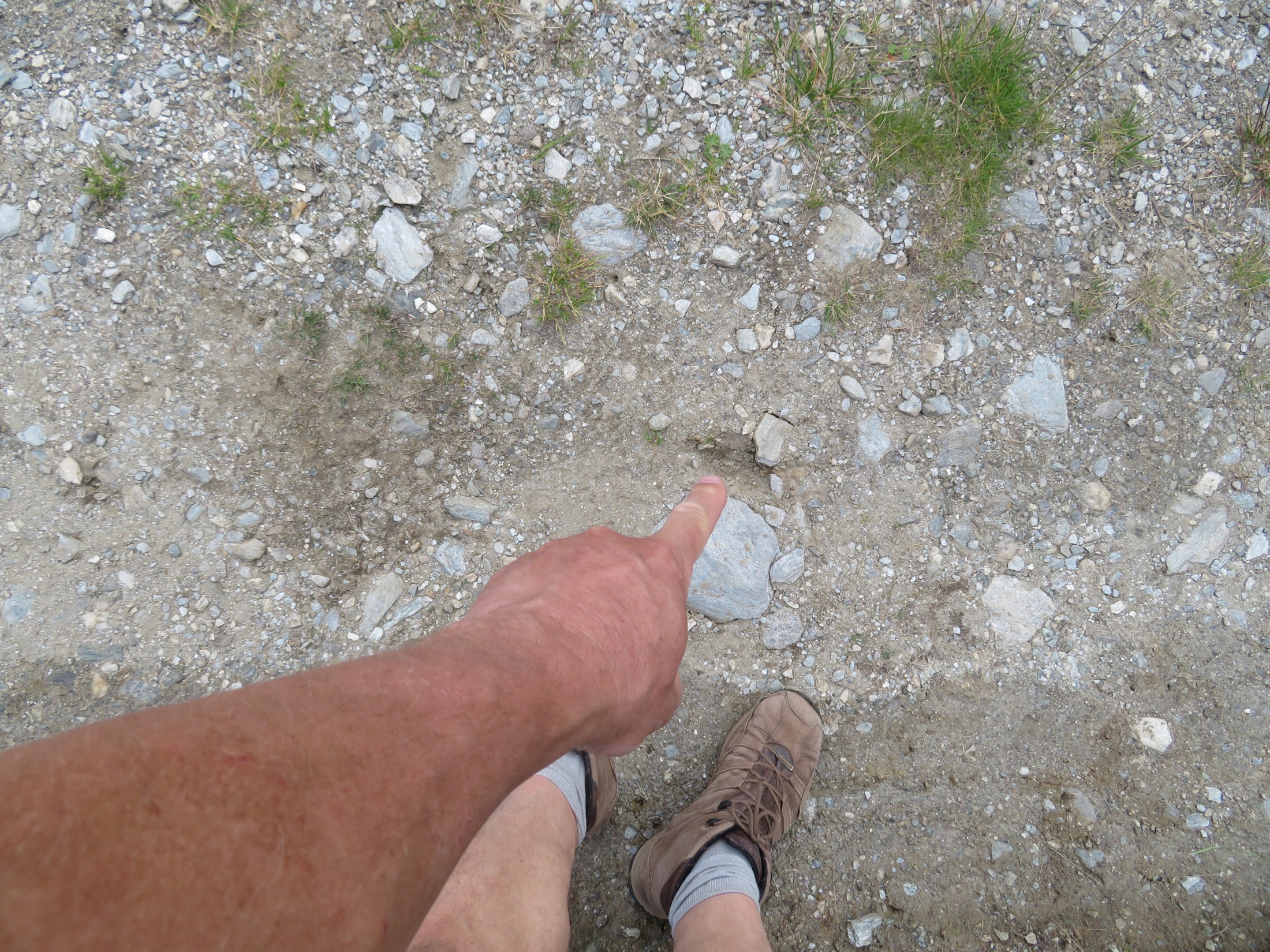 Bruchstücken des Wegschotters ins Auge. Der besondere Stein war in den Boden gedrückt und im Weg halb „vergraben“. Dennoch: